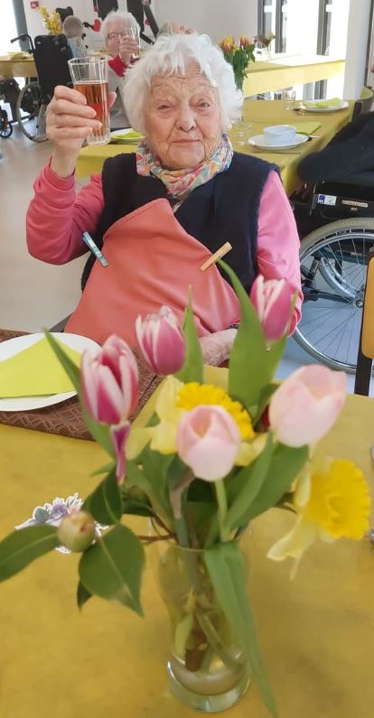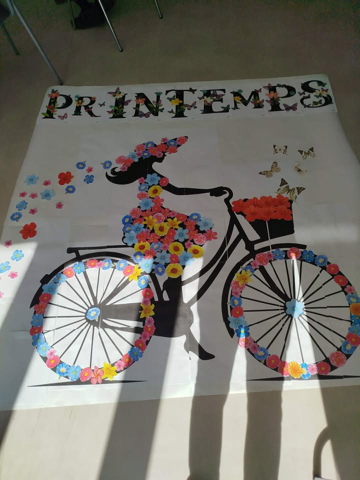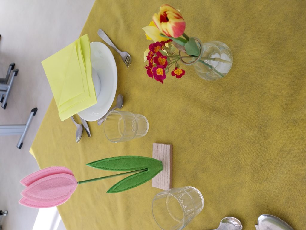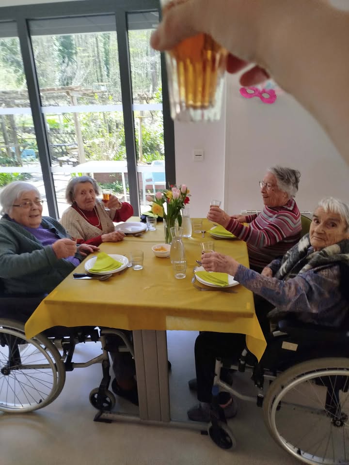 A l’occasion du 1er jour du printemps, des jolies tables ont été dressées, des décorations se mettent en place. Une dame des saisons a été réalisé par des résidents. Un apéritif a été servi ce midi aux résidents !